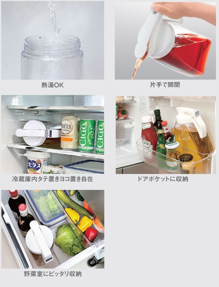 商品簡介: 日本製造 BPA Free 即使橫放都不會洩漏 緊貼在雪櫃層架 可單手打開和關閉易於使用 由創新的耐熱材料製成,可以直接放熱水 寬口容易清潔 壺蓋可用洗碗機 容量: 1.3公升
