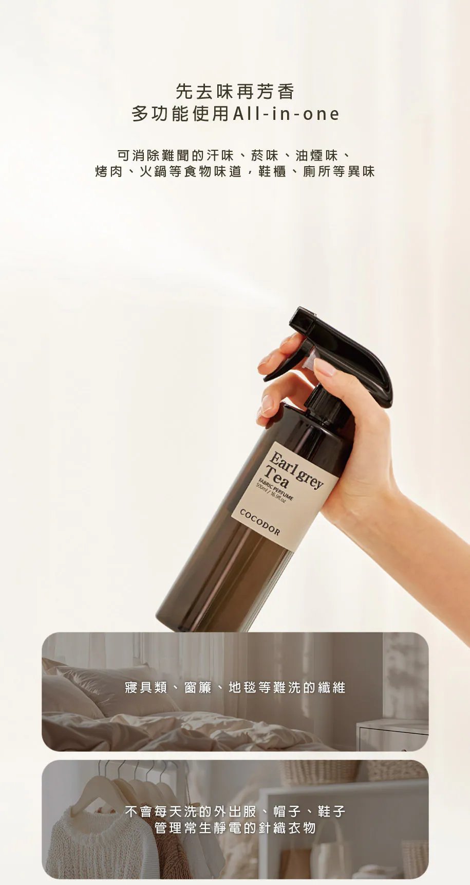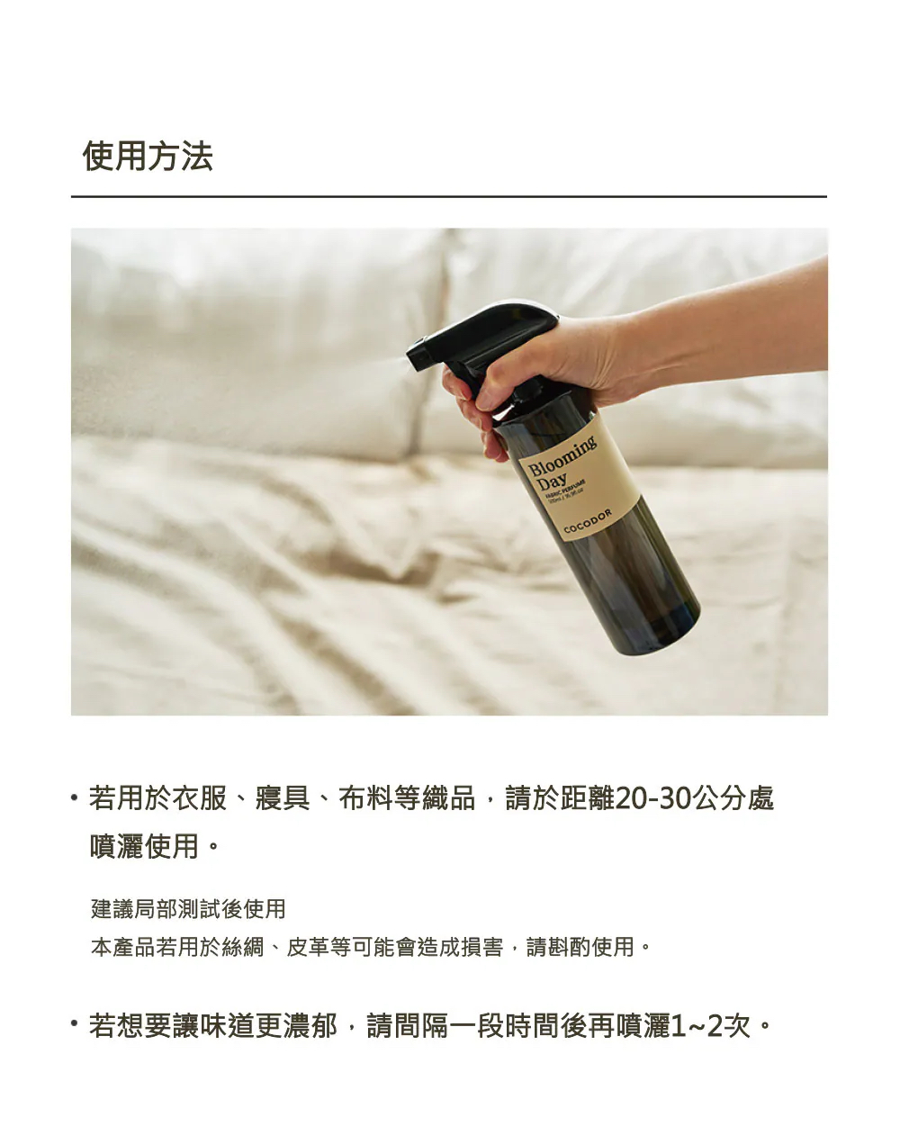 .Garden Lavender 花園薰衣草 與中性的薰衣草薄荷香氣融合成為魅力香氣 ✨柿子葉、綠茶植物萃取,天然消臭力。 ✨透過韓國皮膚刺激性測試。 ✨可減少99.8%的靜電。 ✨通過安全測試,未驗出5種有害物質。 可以直接於布料使用的空間香氛噴霧 .去除難聞的氣味,讓物件及房間充滿香氣 .含有柿子葉和綠茶萃取物,配合穀物發酵酒精基底的天然消臭配方 .通過FITI除臭力測試,有效消除難聞氣味,香氣持續力長達6小時 .採用韓國國產高級香料,獨家香氣調配處方 .通過安全檢測,獲IFRA認證,通過皮膚刺激測試 |使用方法 How to use 1. 在需要香氣的衣物、寢具、布料材質上,保持20~30cm距離噴灑 2. 請僅用於布料材質,皮革、絲綢等可能有損傷風險,需謹慎使用(*建議先在局部測試後再使用) 3. 若想要更濃鬱的香氣,可間隔一定時間追加噴灑1~2次。 4. 500ml裝使用時,可透過噴頭處的ON/OFF開關調整鎖定狀態