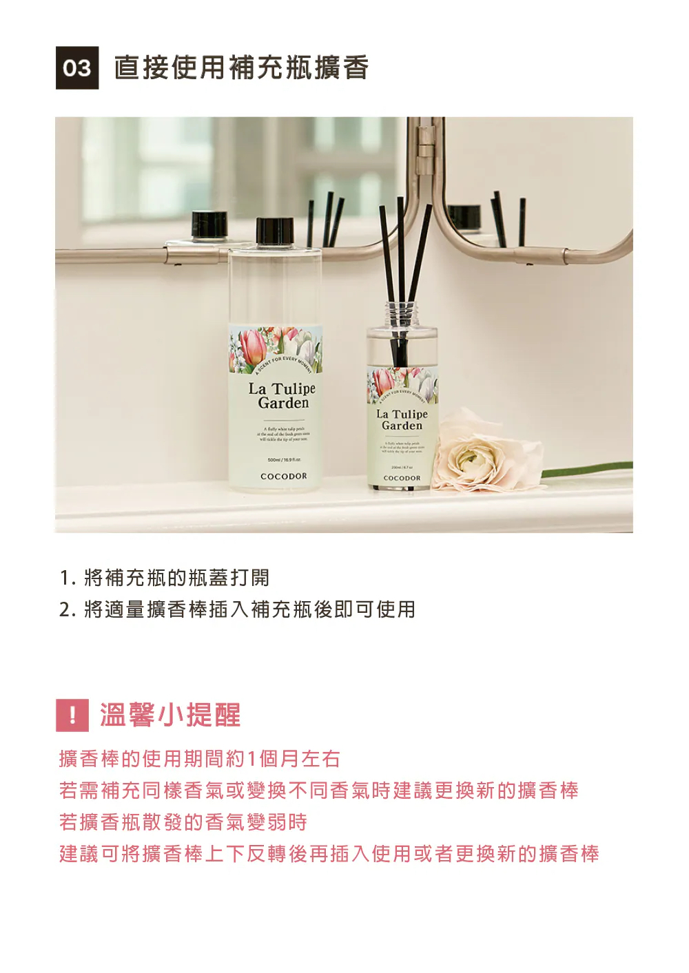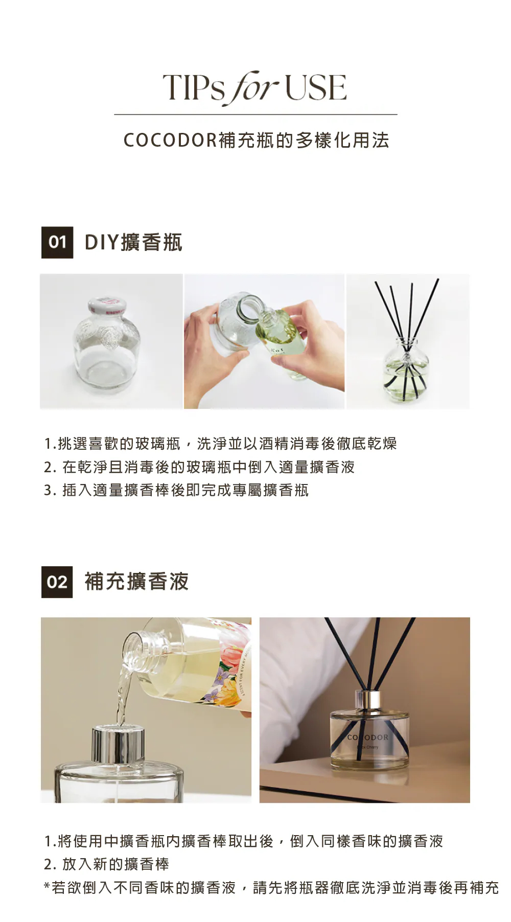 韓國Cocodor香薰擴香補充瓶 200ml - 英國小蒼蘭 (English Pearfree) • 獨家香氣調配處方 • 採用韓國國產高級香料 • 多種水果、花朵的香味混合配搭 • 調配出你的命定香氣,耐溫而不甜膩 • 家居氣氛格調即時變得更高級 • 通過安全檢測,香料皆獲IFRA認證 • 超過10萬人使用後評價 • English Pearfree(英國小蒼蘭) 前調 青檸、英國梨、蜂蜜 中調 玫瑰、鈴蘭、小蒼蘭 後調 琥珀、紫檀香 甜蜜感 4/5 清爽感 3/5 濃度 3/5 ▍內容物:擴香補充瓶200ml (無紙盒環保包裝) ▍尺寸:5x5x13cm ▍產地:韓國