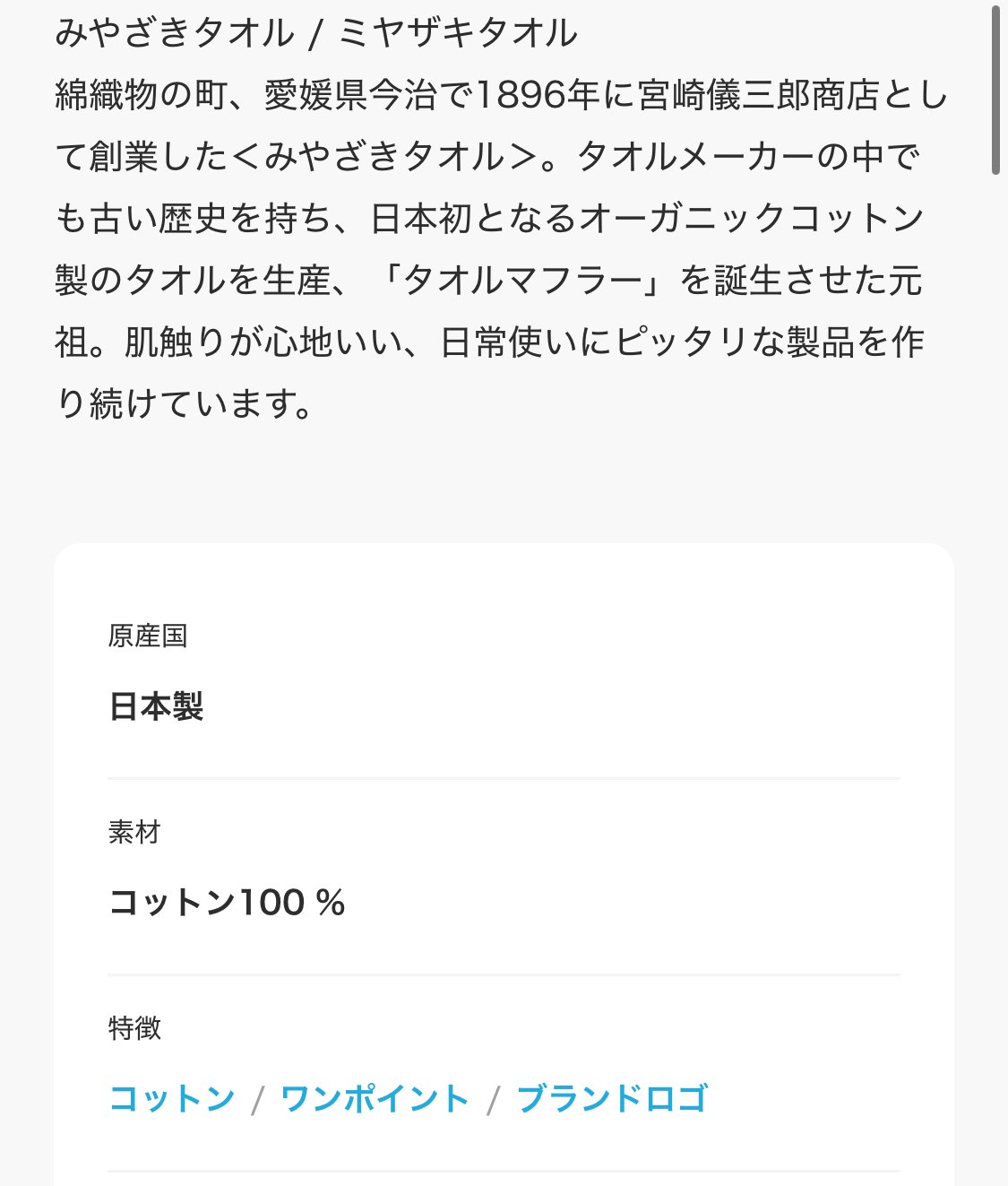 One size : 35*160cm 一年四季都離不開的四季圍巾 1896年創業的愛媛縣今治市的老字號毛巾製造商訂製圍巾。 像毛巾一樣柔軟的觸感,具有透氣性的編織面料又輕又不笨重,還能吸收汗水,使用起來很舒服。 簡單的設計,是容易搭配的經典單品。< Beams Japan〉的標誌用同色的線用刺繡來表現。 正好適合寒冷的季節變化,夏天的曬傷對策也很方便。 一年四季都放不下的毛巾圍巾。