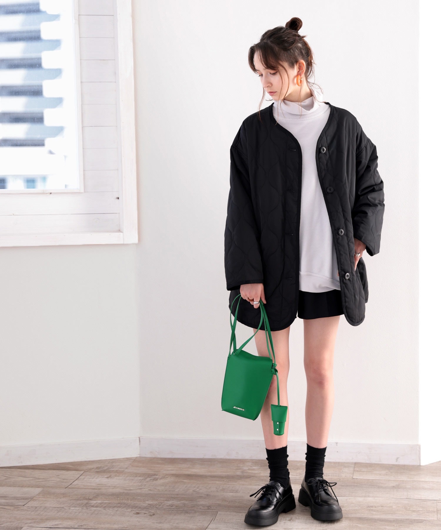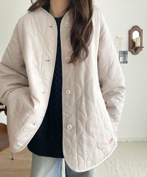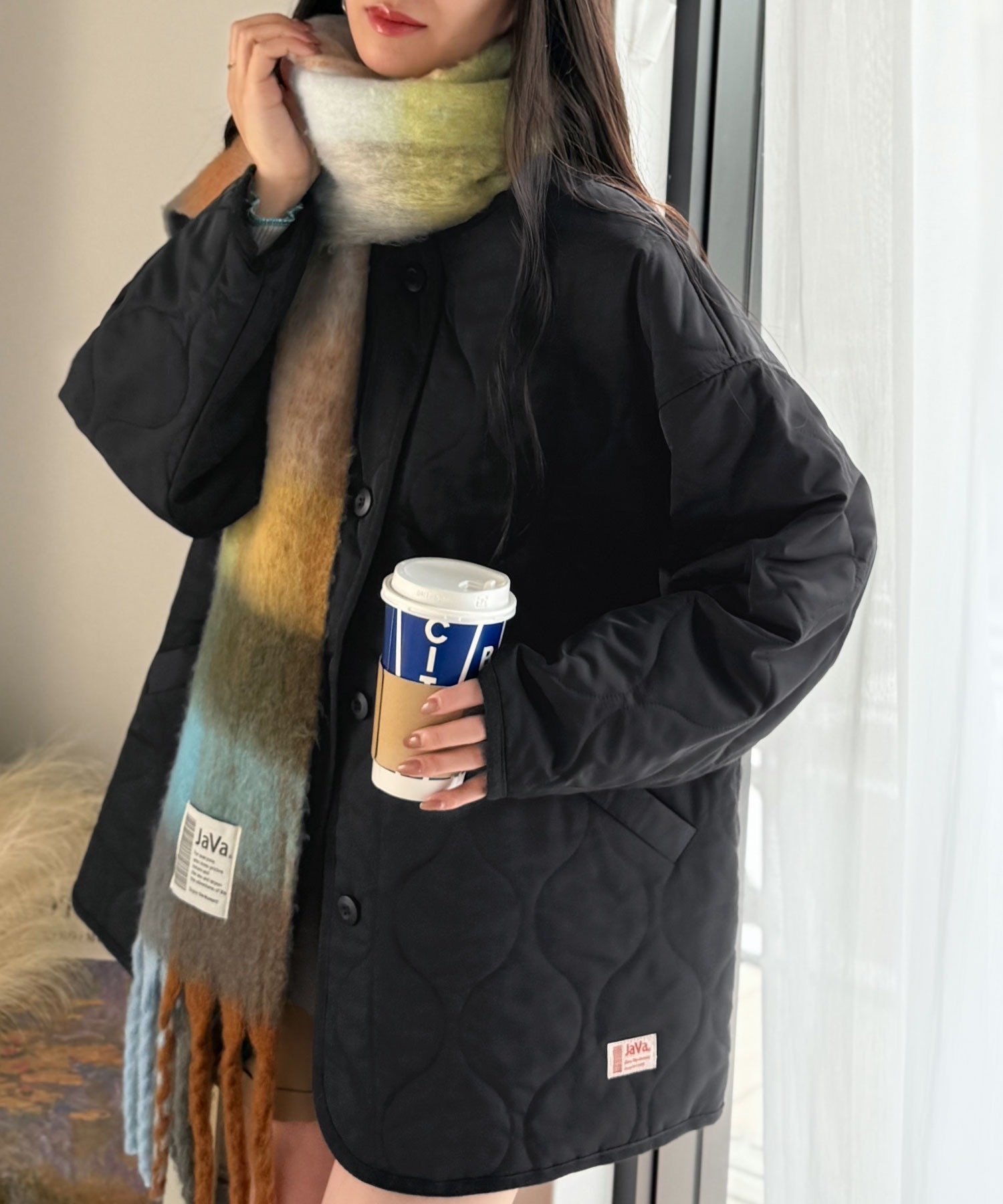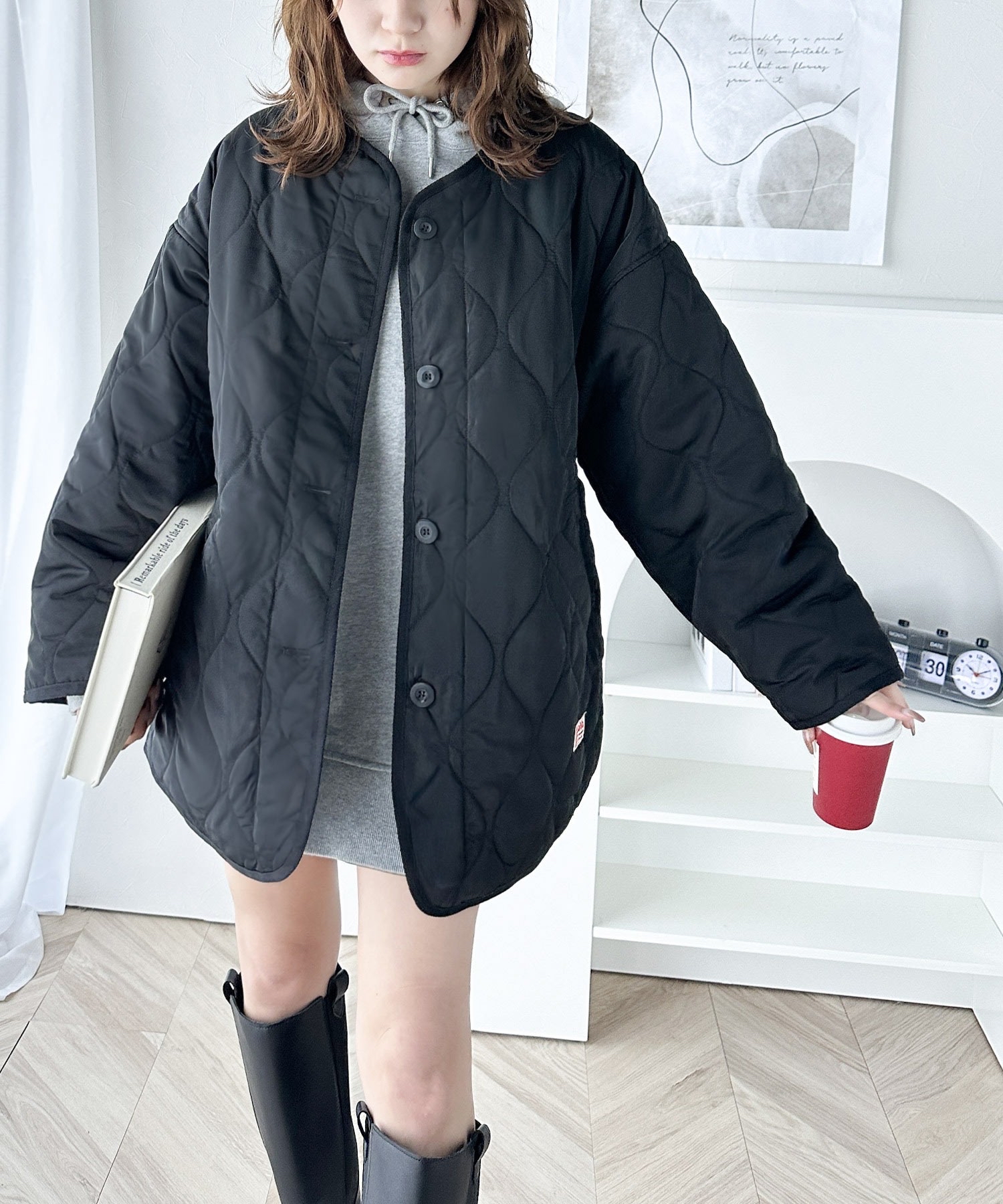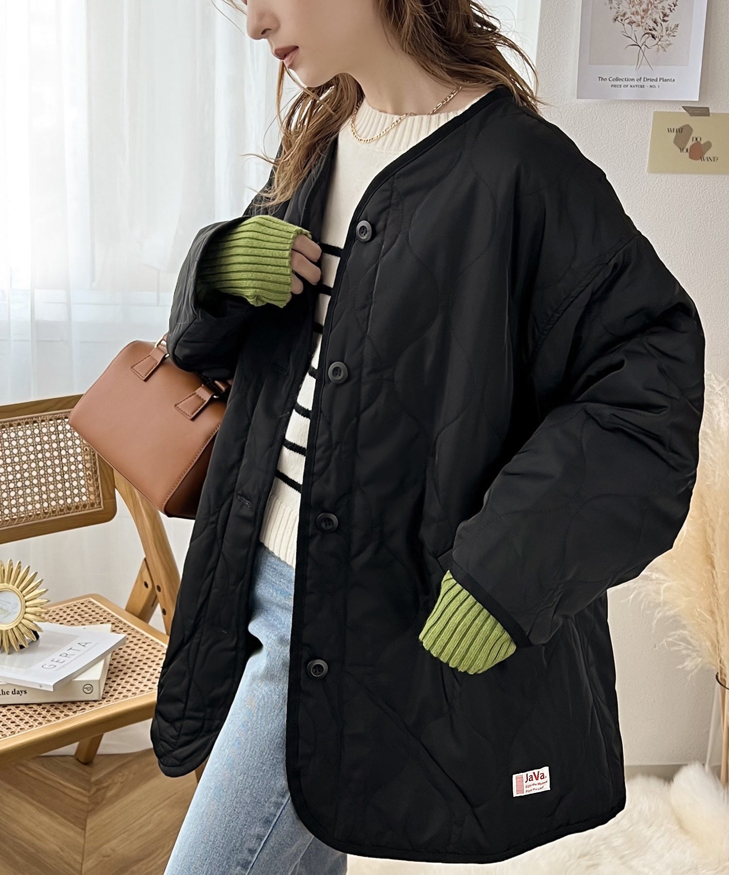 可以隨便披上的成人優雅的外套的絎縫大衣。 在各種季節都很有用的女士絎縫無領夾克登場! 簡單的設計,和任何搭配都很搭。 ・隱藏到臀部的長度感,遮蓋體型效果極佳 ・使用中棉,冬天自不必說,適合早春的早晚防寒。 ・潮流的超大尺寸 ■細節 波浪形的絎縫營造出成熟的女性氣質。 絕妙的超大尺寸和恰到好處的厚度,可以輕而易舉地披在身上是其魅力所在。 解開領子穿的話,會有一種很舒適的感覺,是適合各種搭配的夾克。 ■工廠 波浪形的絎縫,光是穿著就增加了舒適感。 ※做得比較大。