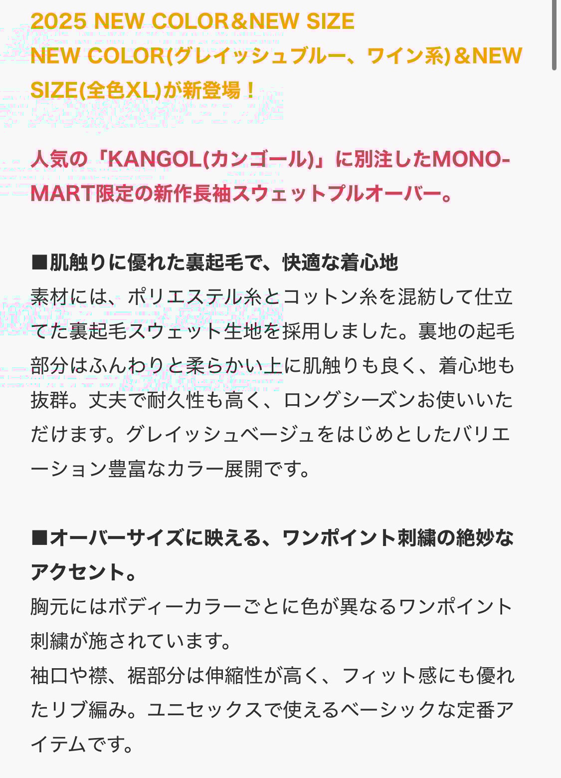 2025 新顏色&新尺寸 NEW COLOR &NEW SIZE(全色XL)新登場! 人氣KANGOL單獨訂購的MONO-MART限定的新款長袖衛衣套頭衫。 ■觸感極佳的背面刷毛,穿著舒適 材質上採用了滌綸線和棉線混紡而成的內襯起毛衛衣面料。 內襯的刷毛部分柔軟,手感也很好,穿著也很舒服。 堅固耐用,可以長期使用。 以灰米色為首的變體豐富的顏色展開。 ■與超大尺寸相映成趣,單點刺繡的絕妙點綴。 胸前塗有不同身體顏色不同顏色的單點刺繡。 袖口、領子、下襬部分彈性高,合身度也很好的羅紋編織。 男女皆宜的基本經典單品。 ■用當季的超大尺寸來表現潮流感和放鬆感。 作為單件服裝作為造型的主角自不必說,作為皮夾克、牛仔夾克等內衣也發揮了存在感。 與基本的牛仔長褲和漂亮的闊腿褲等廣泛的下裝非常相配。