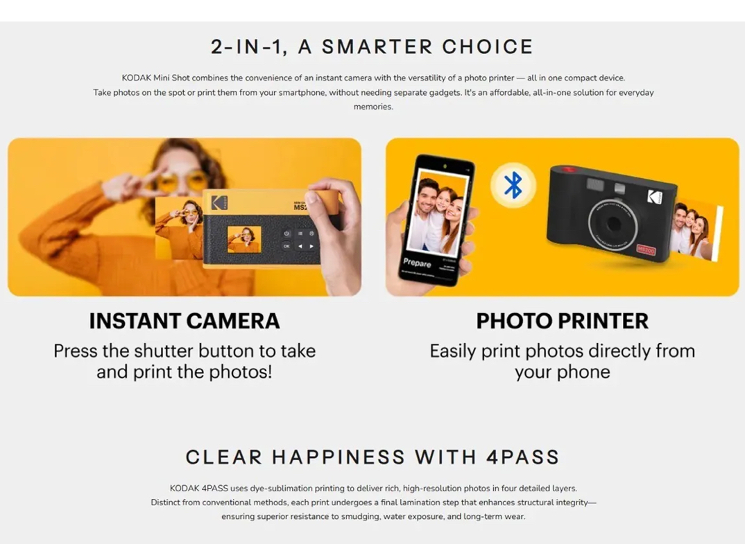 Kodak Mini Shot 2 ERA #ms200 影完即Print,回憶實體化!😍 今次呢款 Mini Shot ERA 系列 可以做到: 👉 影相 → Print 即時完成 👉 手機相片 → Print 👉 連藍牙 → 打印你IG / 自拍 / 旅遊相 即影即有 = 不用等、一定有Feel🤎 買返嚟做日常影相、旅行影咗即印、甚至送禮都超有Sense 4PASS™ 真正相紙級打印技術 唔係普通熱感貼紙⚠️ 係 291×300dpi高質熱昇華打印 影出嚟嘅相: ✔ 不掉色 ✔ 不模糊 ✔ 係真實色彩、膠片感覺滿滿🎞 相紙仲係防水+防污!🌧☕️✋ 即係:你影嘅回憶 → 真係可以Keep好多年。 🎥 Camera規格唔係玩玩下📸 📌 13MP 相機 📌 自動對焦、ISO自動調整 📌 閃光燈(開 / 關 / Auto) 📌 1.7吋LCD畫面,影咗先睇效果 📌 支援手機藍牙傳相打印 平時影IG、Cafe打卡、影寵物、影靚女靚仔再Print貼相簿=超治癒