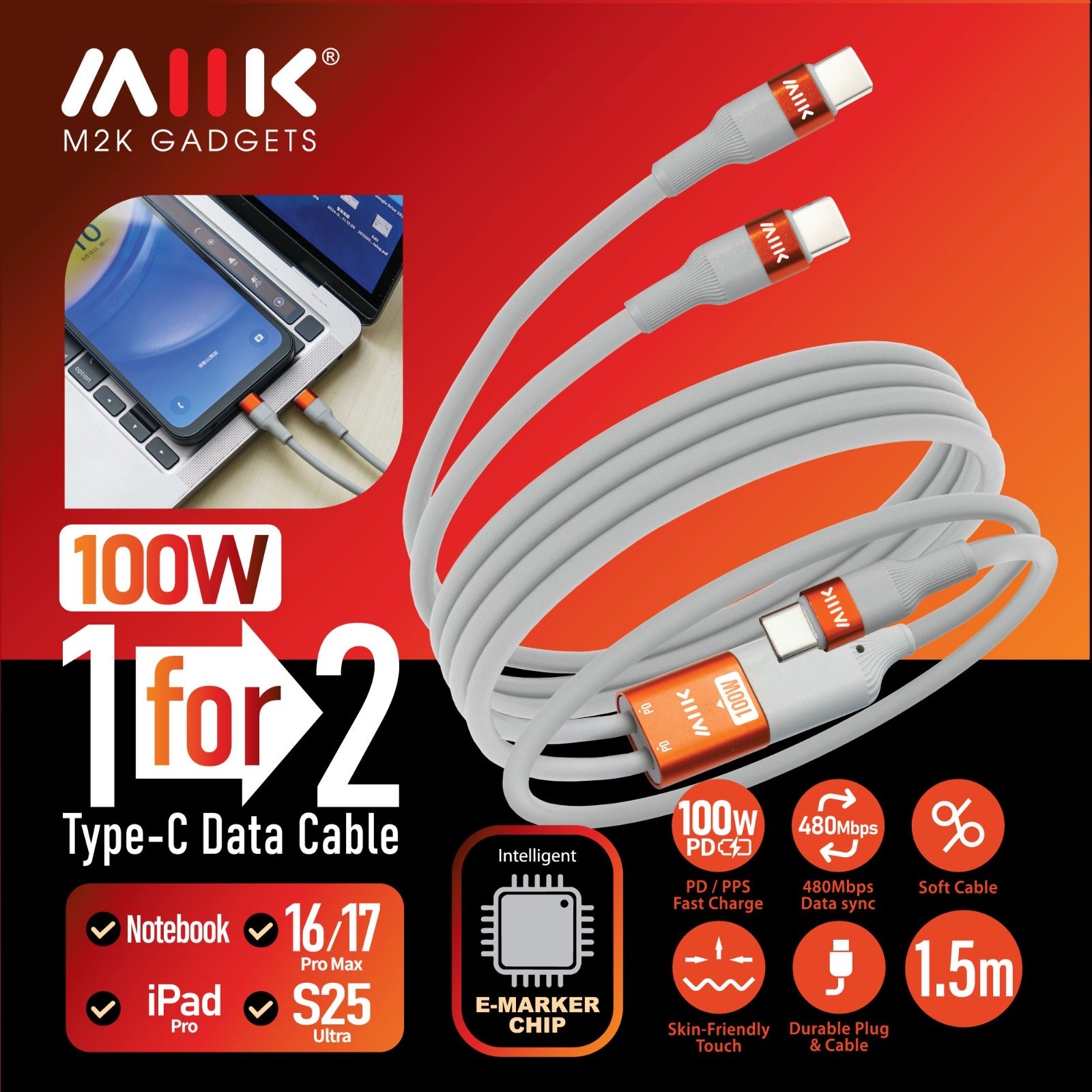 *🚀他來了!真正實用的雙出線來了!* *M2K 100W 1 for 2 Type-C 雙頭快充傳輸線* *雙頭輸出 × 超長線身 × 高速傳輸 × 安全穩定* 市面上嘅多出線產品,不是線太短,就是設計唔貼心,兩部機一齊叉電都要擠埋一堆,超唔方便! 但今次呢條 *M2K 雙出線* 真係令人眼前一亮: --- *🌟 產品亮點* - *雙頭輸出設計* :一條線同時叉兩部裝置,無論係手機 + 平板,定係手機 + 筆電,一線搞掂! - *超長 1.3 米線身 × 2* :兩條分線都夠長,兩個人一齊用都唔會拉扯,空間感十足。 - *PD 100W 超強輸出* :支援筆電快充,效率爆燈,唔洗再等到天荒地老。 - *內建 E-Marker 晶片* :智能識別裝置,確保電流穩定輸出,保護你嘅設備安全無憂。 - *480Mbps 高速傳輸* :資料過檔快狠準,工作娛樂兩不誤。 - *柔軟耐用線材* :高質感編織線身,手感一流,耐拉耐用,唔易打結。
