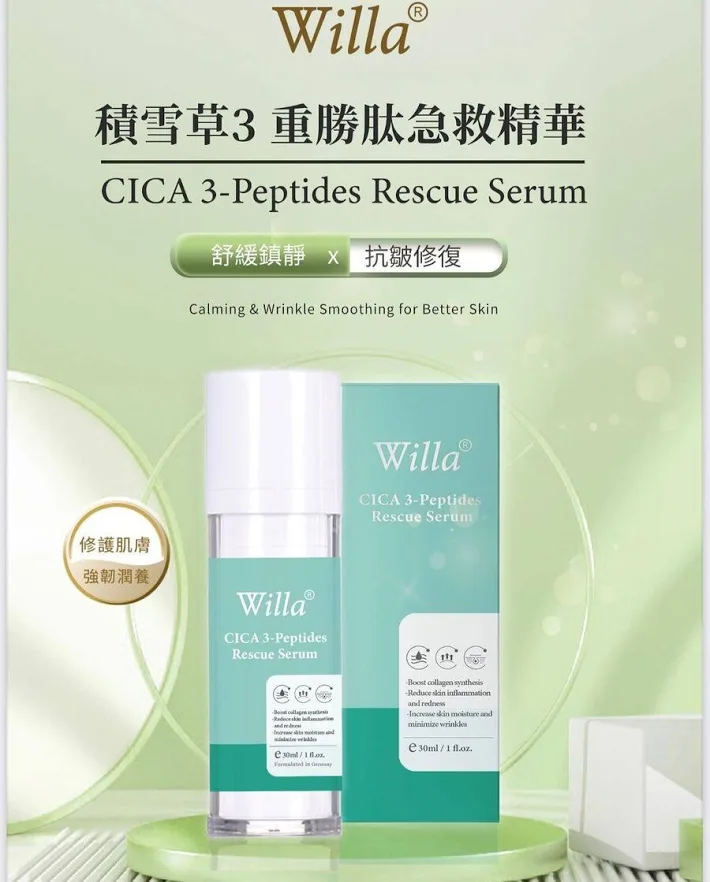 Willa 積雪草外泌體舒緩逆齡霜 50ml 大熱外泌體🔥 專為敏感及成熟肌設計,進行深度保濕與舒緩! 積雪草外泌體+1000K透明質酸,天然修復,肌膚自帶隱形水膜💦 ✨專門為敏感及成熟肌而設 ✨提升肌膚彈性 ✨改善乾紋/皺紋及表情紋 ✨逆齡美肌 ✨舒緩敏感紅腫的肌膚 ✨鎖水及保濕肌膚 —————我是分隔線————- Willa 積雪草外泌體奇蹟再生眼霜 30ml 大熱外泌體🔥 專為眼周脆弱肌膚設計,進行深度保濕與舒緩! ✳️德國黑科技成分大揭秘 ▸ 積雪草外泌體🪐:聽落科幻但真係work!修復力比普通精華快3倍(自己塊過敏眼皮作證👁️🗨️) ▸ 磨菇葡聚糖🍄:保濕到好似幫眼周「打水光針」, 化妝唔再卡粉出乾紋🎭 ▸ 咖啡因☕:朝早捽兩圈,即刻消除浮腫眼‼️ —————我是分隔線————- Willa 積雪草3重勝肽急救精華 30ml 積雪草奇蹟瞬間舒緩,極致保濕提升光滑度!🌟🌟 🌿 積雪草,呢個傳說中嘅雷公根或者老虎草!經實驗證明,佢可以減少皮膚發炎,促進膠原蛋白合成,增強皮膚嘅儲水同鎖水力,仲可以對抗導致肌膚衰老嘅自由基!簡直係肌膚嘅救星!💧 💎 Willa呢款精華採用德國配方,入面仲有寡肽-1、寡肽-2同埋寡肽-5,呢啲成份有效刺激肌底下嘅膠原蛋白合成,有效減少皺紋同細紋嘅出現,令你嘅皮膚更加光滑緊緻同年輕!💫 我自己用咗一個星期,真係覺得皮膚有如重生!紅腫敏感情況即刻減少,保濕效果勁強,皮膚成日都水潤潤,光滑得嚟仲好有彈性!而且皺紋同細紋都唔見咗,真係好神奇!😍✨ 功效 ✨加強肌膚的膠原蛋白合成 ✨減少皮膚敏感和紅腫現象 ✨增強肌膚的保濕度和減少面部皺紋