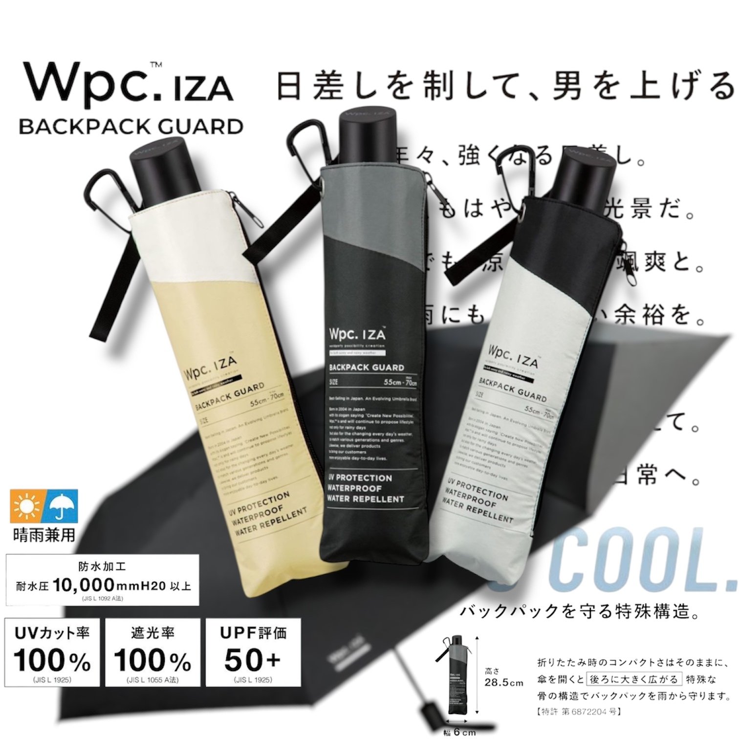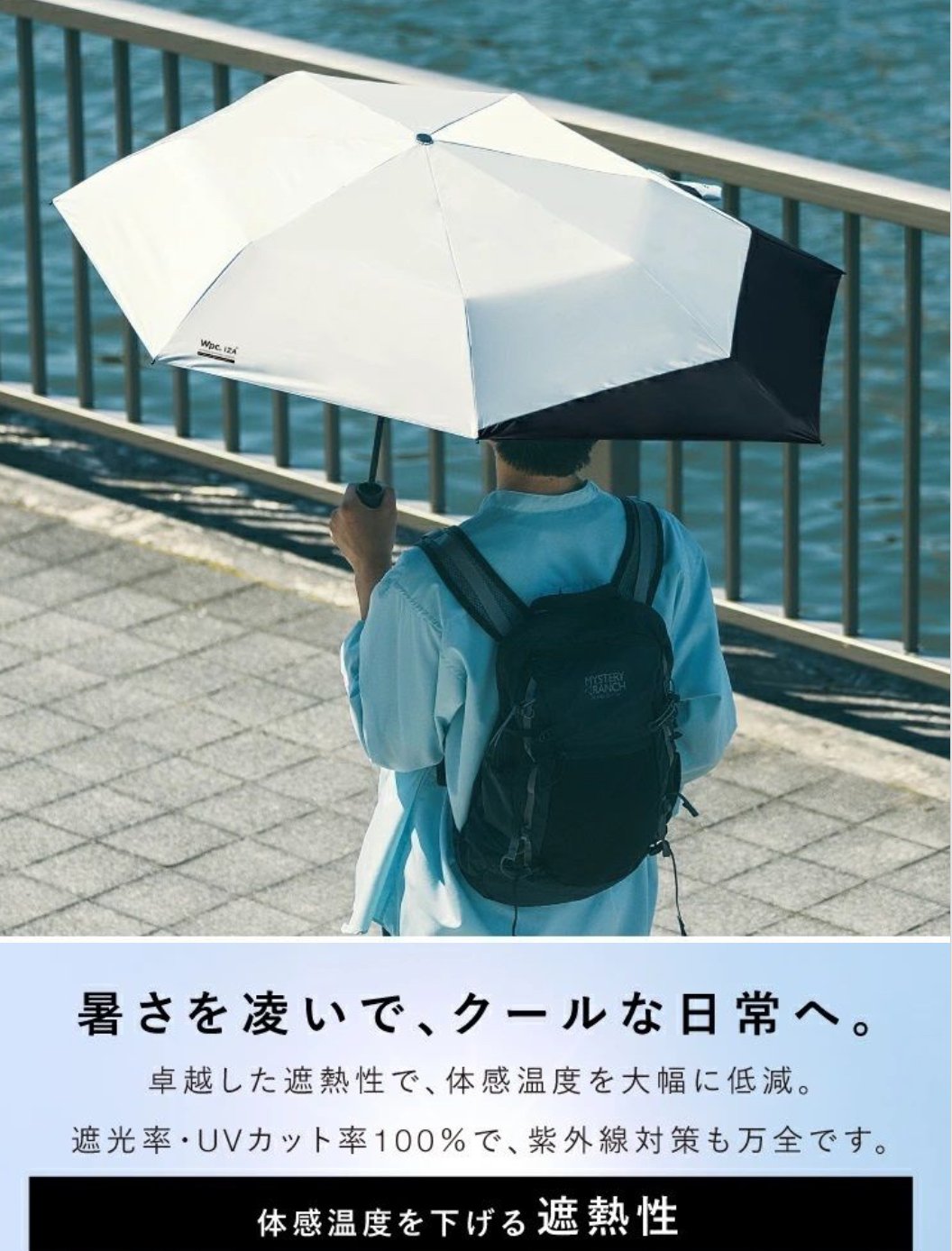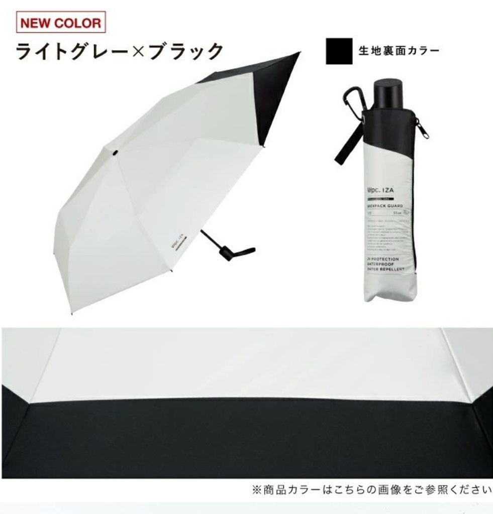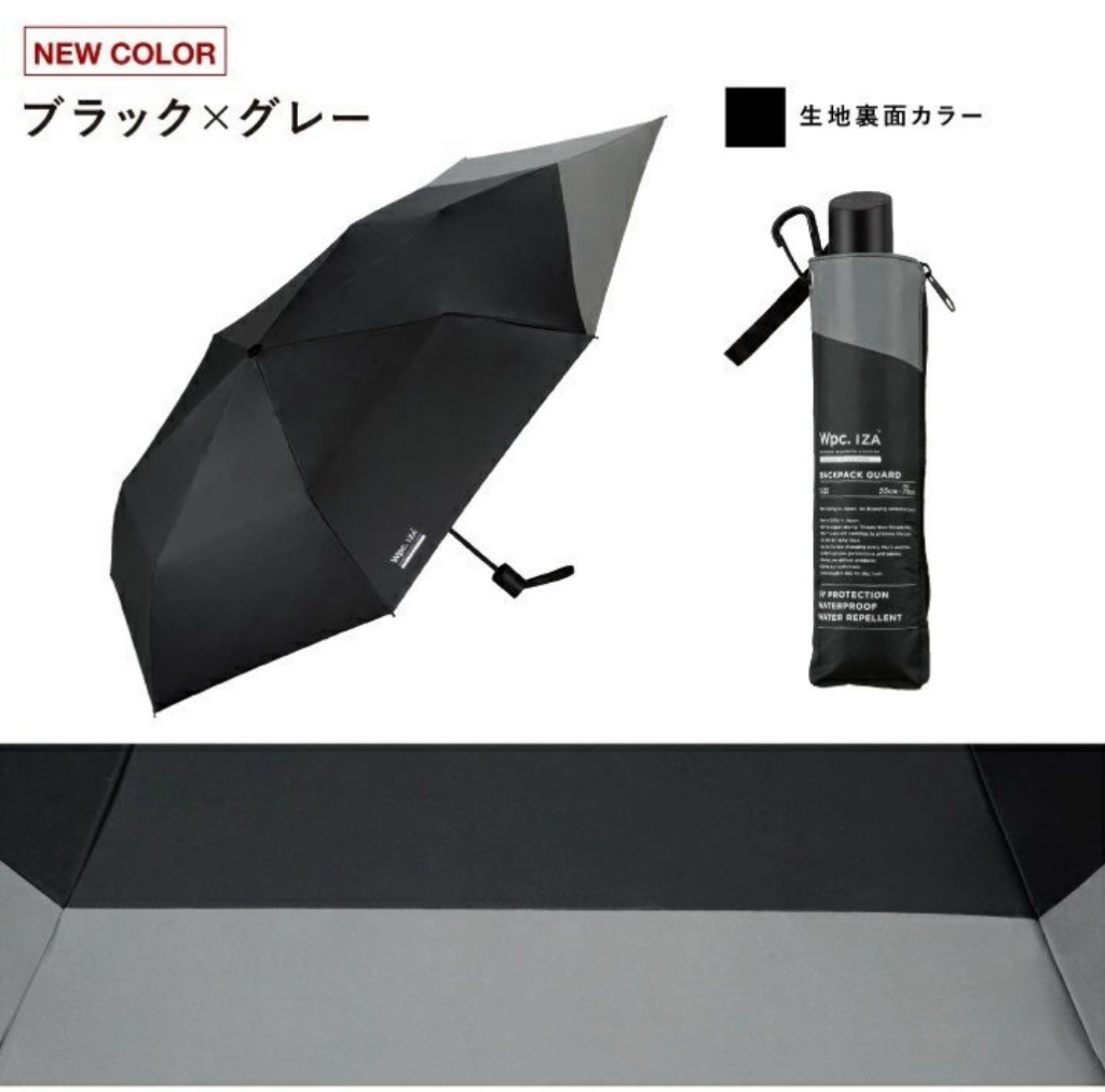 特殊結構【保護背包】的折疊日傘 Wpc. IZA 傘背部特別延展設計,可在雨天及晴天全面保護背包免受濕氣與陽光侵害。 簡約而時尚的造型,適合通勤、通學與日常使用。附有拉鍊式收納袋及配備掛鉤(Carabiner),方便攜帶。 功能亮點: 遮熱性 :特殊塗層降溫效果出色,令體感溫度從 52.8°C 降至 38.1°C 。 汗量減少 :降低體感溫度使汗量減少,改善汗漬與舒適度。 UV防護與遮光 :遮光率100%、UV切斷率100%、UPF50+布料,全方位保護肌膚。 撥水及耐水性能 :提供5級撥水及耐水壓 10,000mmH2O ,適用於大雨。 手動開閉設計 ,讓開閉過程流暢且安全。
