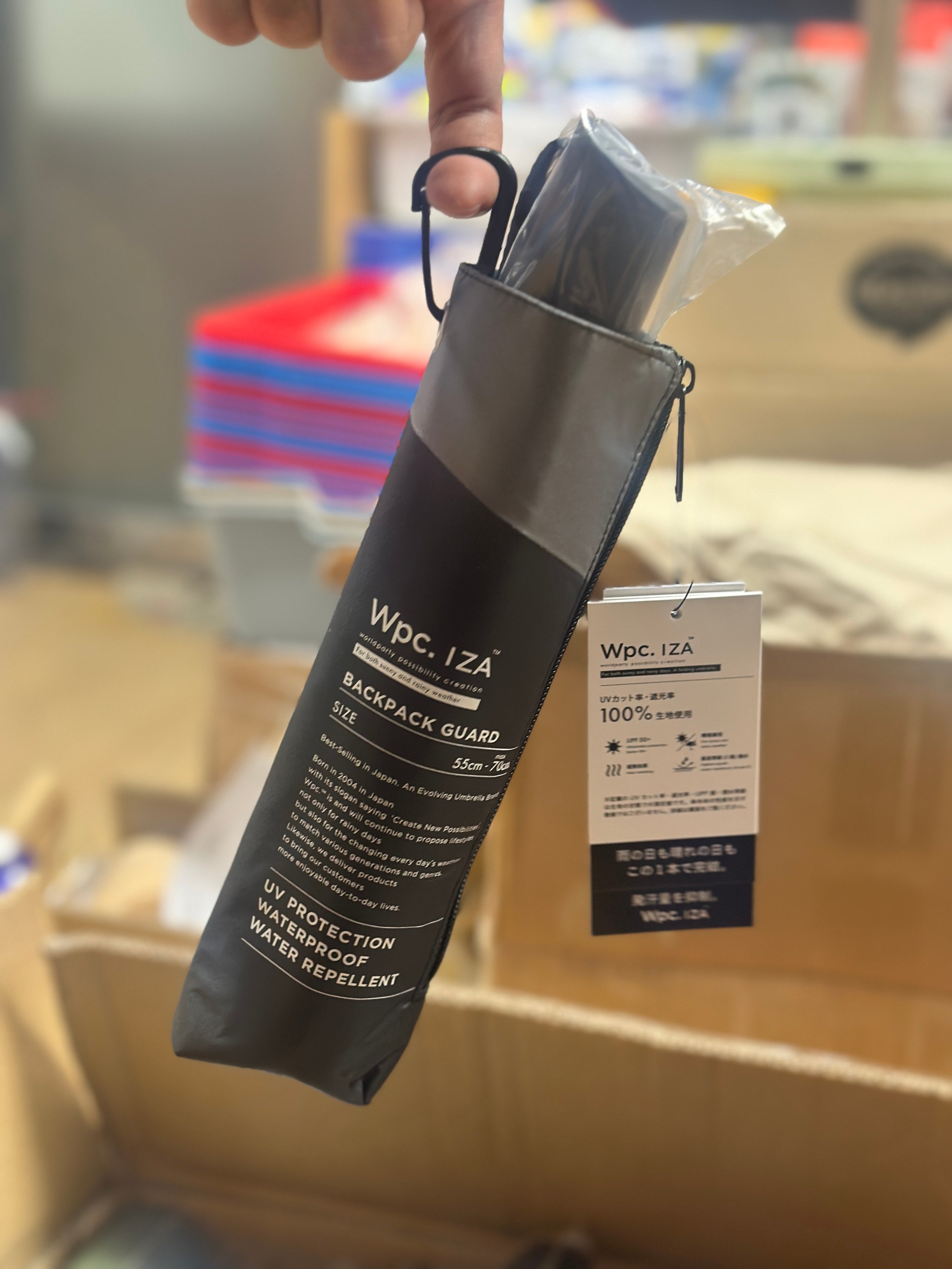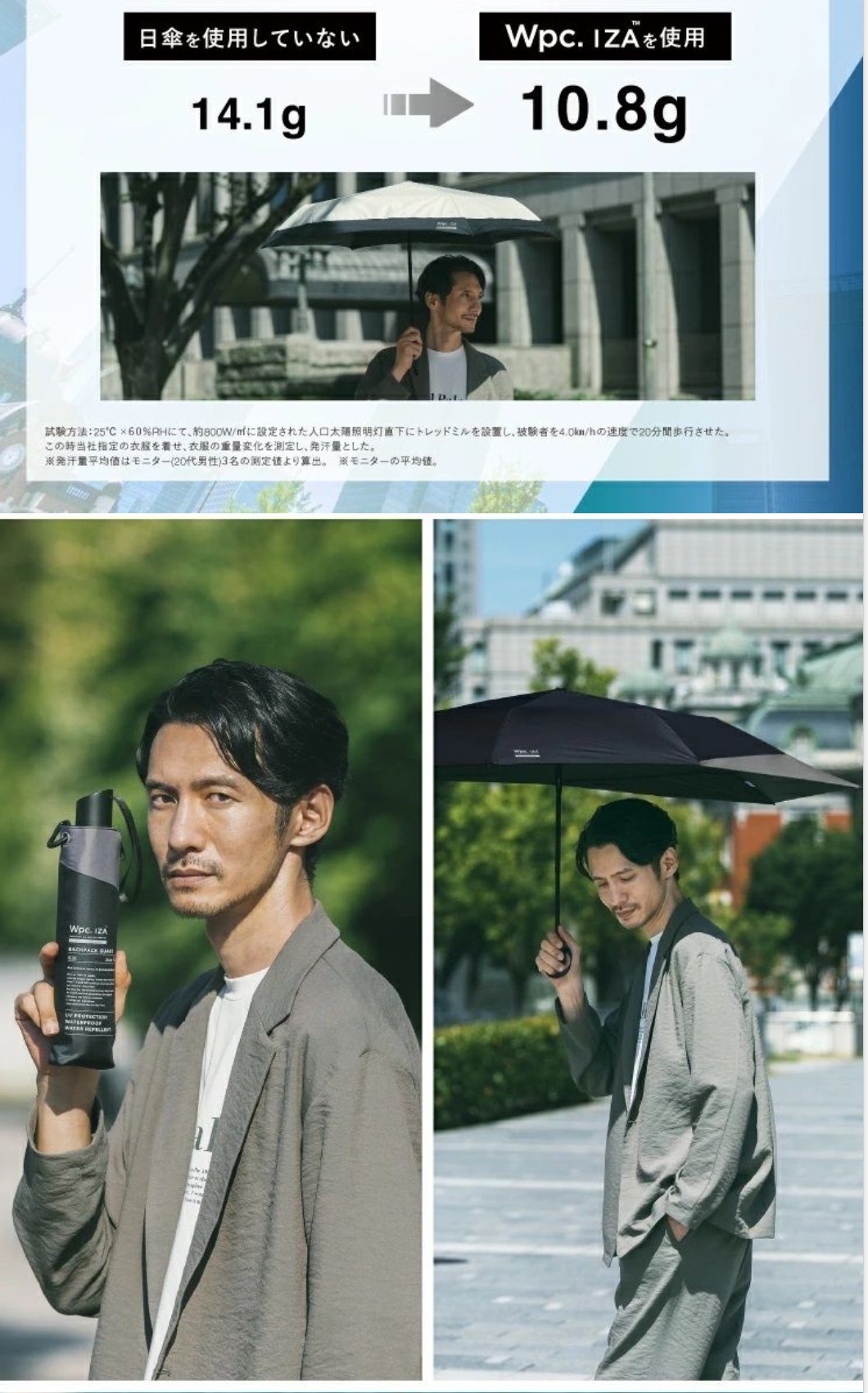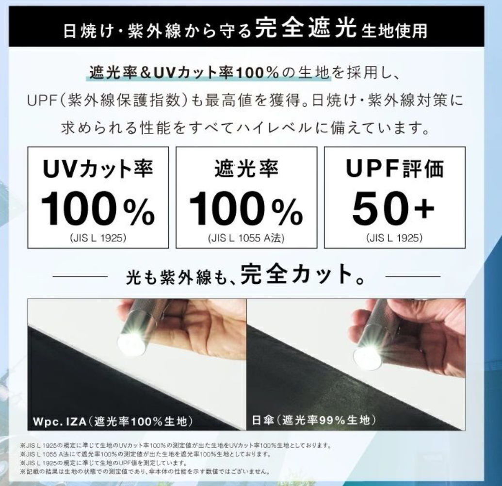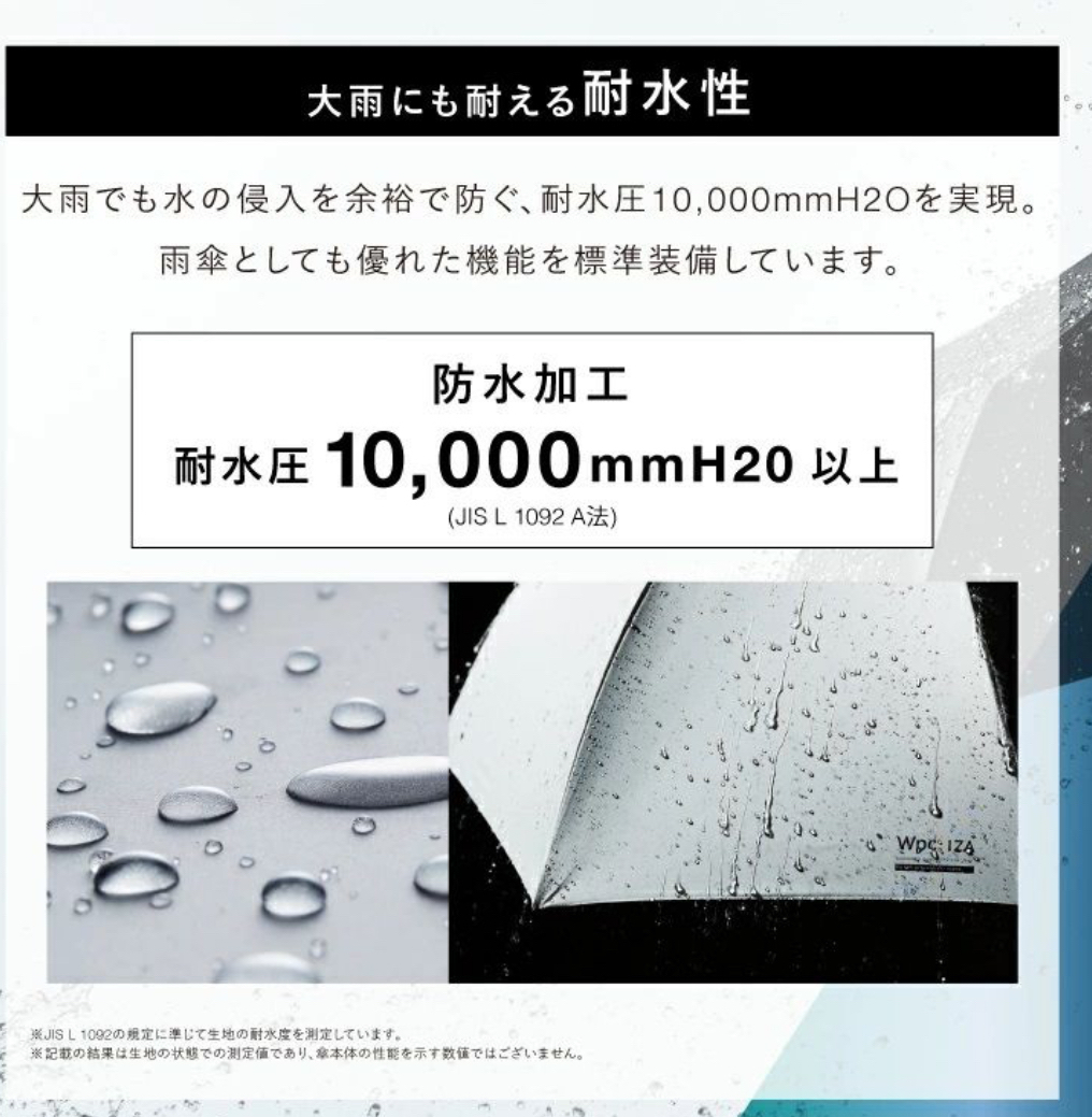 特殊結構【保護背包】的折疊日傘 Wpc. IZA 傘背部特別延展設計,可在雨天及晴天全面保護背包免受濕氣與陽光侵害。 簡約而時尚的造型,適合通勤、通學與日常使用。附有拉鍊式收納袋及配備掛鉤(Carabiner),方便攜帶。 功能亮點: 遮熱性 :特殊塗層降溫效果出色,令體感溫度從 52.8°C 降至 38.1°C 。 汗量減少 :降低體感溫度使汗量減少,改善汗漬與舒適度。 UV防護與遮光 :遮光率100%、UV切斷率100%、UPF50+布料,全方位保護肌膚。 撥水及耐水性能 :提供5級撥水及耐水壓 10,000mmH2O ,適用於大雨。 手動開閉設計 ,讓開閉過程流暢且安全。